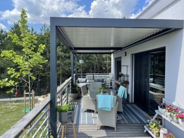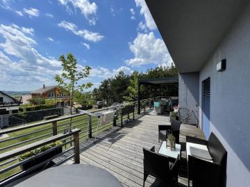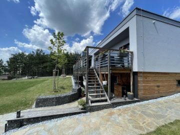 Podloží, na kterém se tento jednopodlažní, podsklepený bungalov nachází, je částečně ze skály a tak bylo potřeba použít speciální techniky a postupů. Dům je zasazen do středně svažitého terénu a směrem do zahrady se pyšní krásnou terasou, kterou její majitelé rádi využívají. Dvouplášťová provětrávaná plochá střecha je připravena na fotovoltaiku a celá stavba splňuje kritéria pasivního domu. Stavba zabrala dva roky.